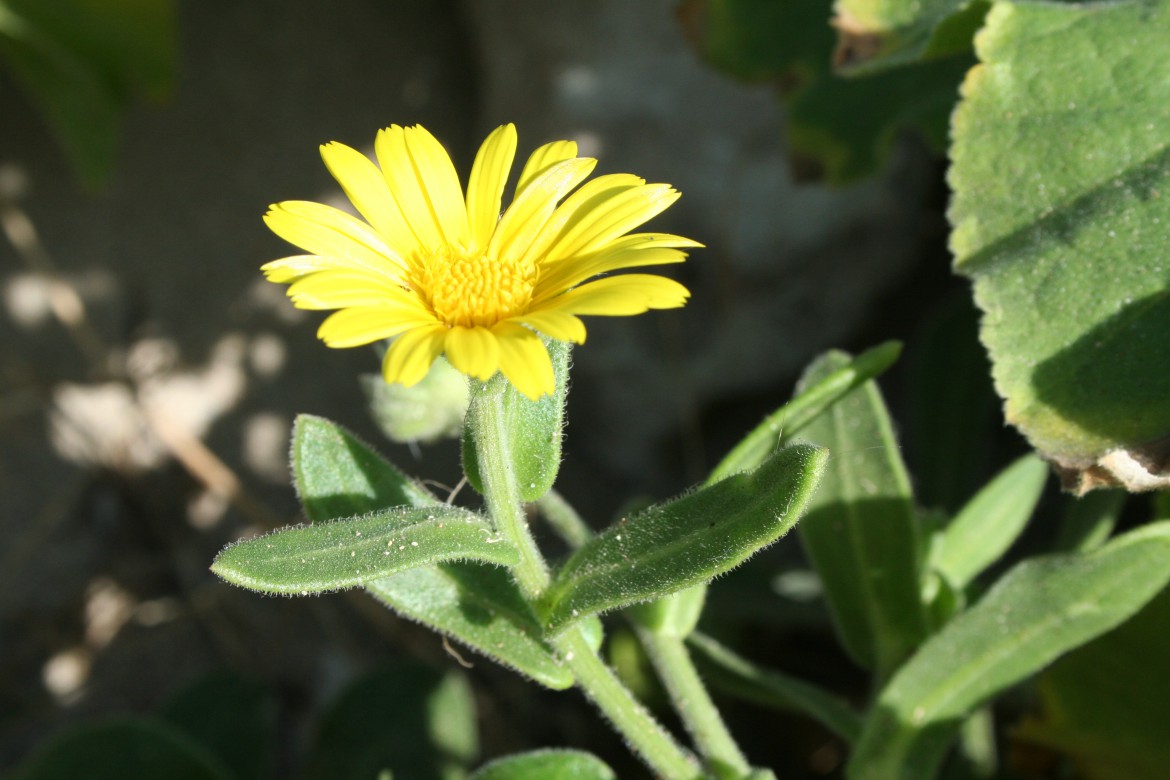 This herbaceous plant is 20-40 cm tall and can be woody at the base. Its stems and leaves are covered with short, sticky hairs. The young stems are upright, later branching and drooping to the ground. Unlike the common ornamental and medicinal plant Calendula officinalis, this species has fleshy leaves with a very strong scent. The leaf blade varies from ovate to linear, depending on the position on the stem. This species resembles a little daisy with yellow flowers 3-5 cm in diameter. The main flowering period is April to June, but some flowers can be found throughout the year and even during winter under particularly mild conditions.