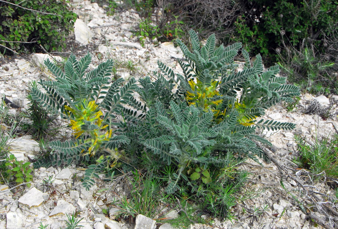 A. macrocarpus subsp. lefkarensis is an erect, hairy perennial shrub with a robust stem 30-60 cm high. The leaves are compound with 15-30 leaflets which are longer than wide, and can be opposite or alternate. The flowers are bright yellow, arranged in axillary clusters of three to nine. The flowering period is between March and April. The fruits are egg-shaped and relatively large (2.5-5 cm) pods, containing up to five large seeds.
