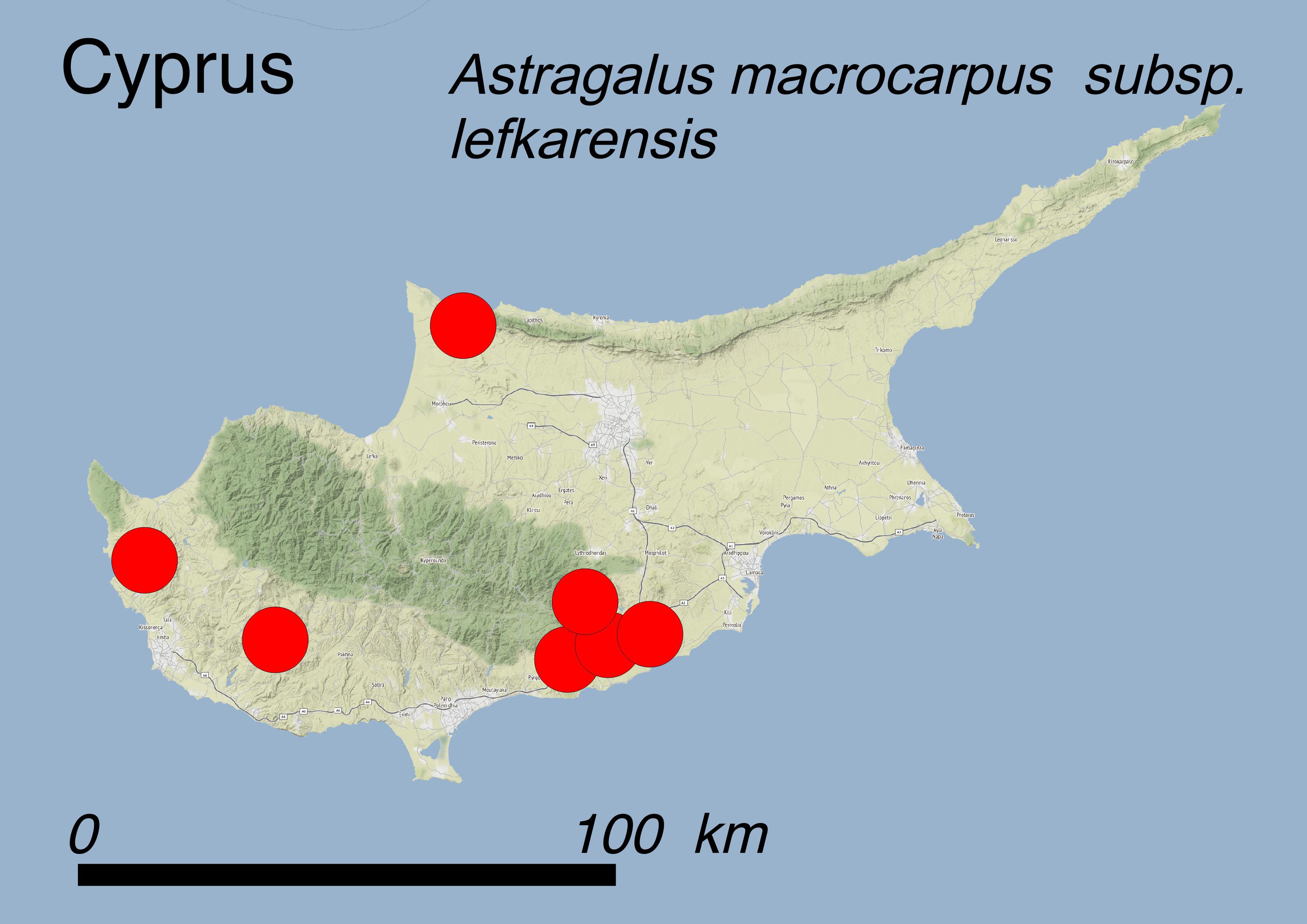 This subspecies is endemic to Cyprus and occurs in seven locations. It is found near the villages of Lefkara (after which the subspecies has been named), Asgata, Tochni, Alaminos, Kormakitis, Kelokedara and Ineia between 75 and 700 m a.s.l. Astragalus macrocarpus subsp. lefkarensis grows on mountain slopes within secondary plant communities derived from the degradation of evergreen mixed forest, i.e. open maquis (habitat 3.8.1.: Maquis, arborescent matorral and thermo-Mediterranean brushes) and phrygana (habitat 3.8.2: Garrigue).