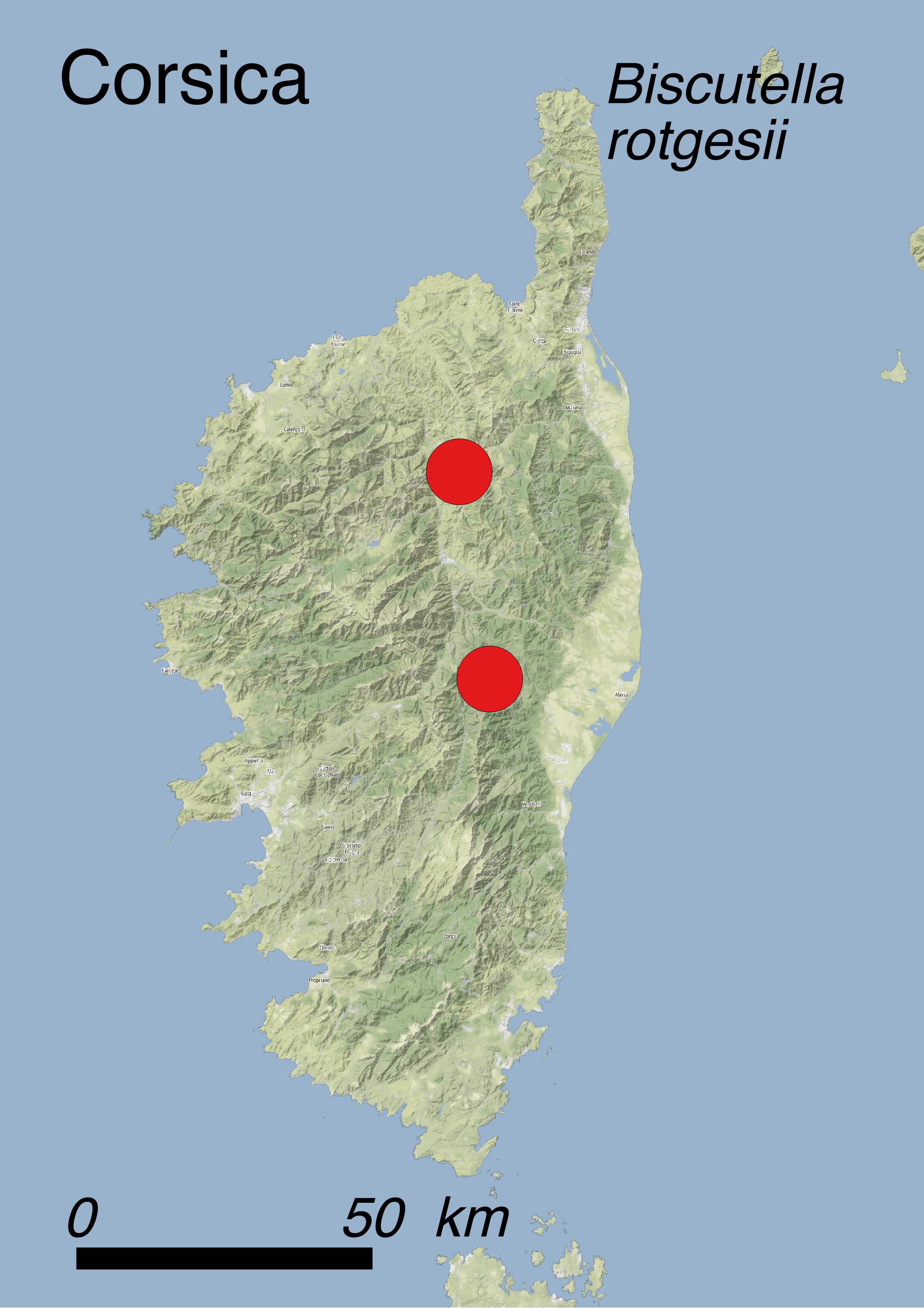 The risk level of Biscutella rotgesii has been downscaled with respect to the first edition of the Top50: it has now been categorized as VU (Vulnerable) according to the IUCN Red List Criteria D2. In fact, although field investigations carried out in 2005 by the Conservatoire Botanique National de Corse (CBNC) allowed to discover three populations covering rather wide areas and counting a high number of individuals, using a 2×2 km grid the AOO is 16 km2, the EOO 45 km2, and the number of populations <5 and the species is prone to several potential threats, such as wildfires (threat 7.1.3: fire & fire suppression: trend unknown/unrecorded) like the one that occurred in 1993 which destroyed most of the population of Ponte Leccia; road construction and maintenance (threat 4.1: Roads and railroads), very risky for the population of the canyon of Trevadine; the alteration of local plant assemblages due to the overwhelming competition and the fast spread of the alien invasive Ailanthus altissima (threats 8.1.2: Invasive non-native/alien species - Named species, and 11.1: Habitat shifting & alteration), and extensive cattle grazing (threat 2.3.2: Small-holder grazing, ranching or farming). Only the population of Salastraco appears to be safe from threats.