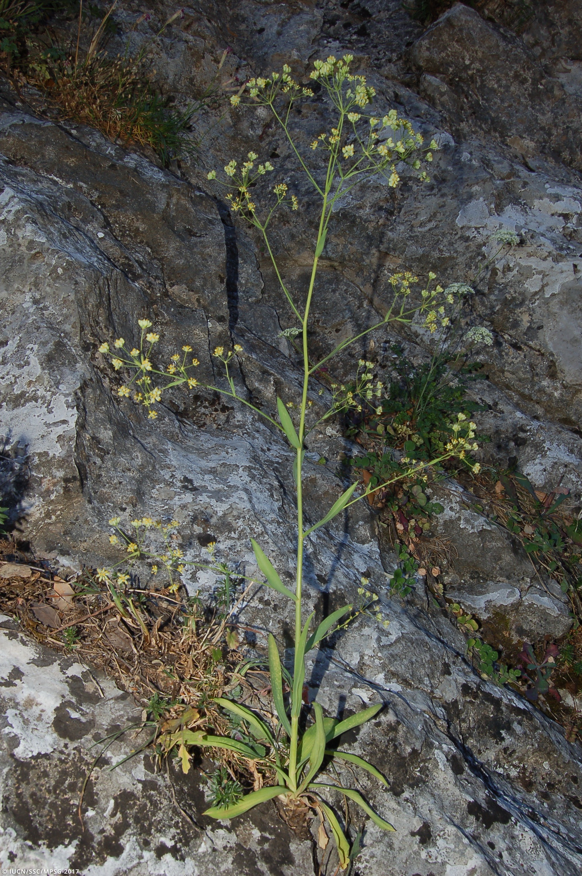 Bupleurum elatum is a perennial herb, up to 80-150 cm tall. The dead leaves remain for a long time at the base of its woody stem, which bears smooth long branches.