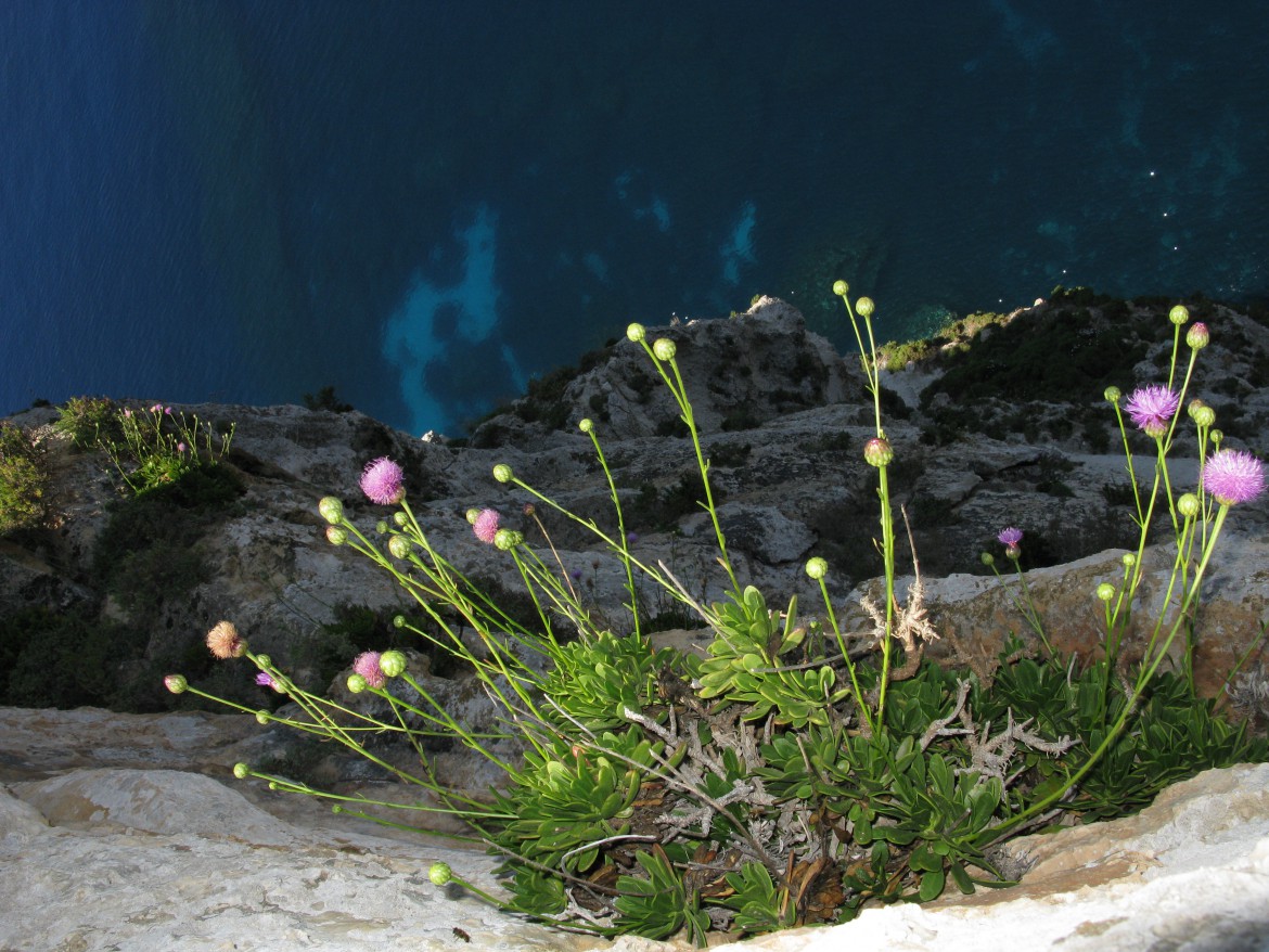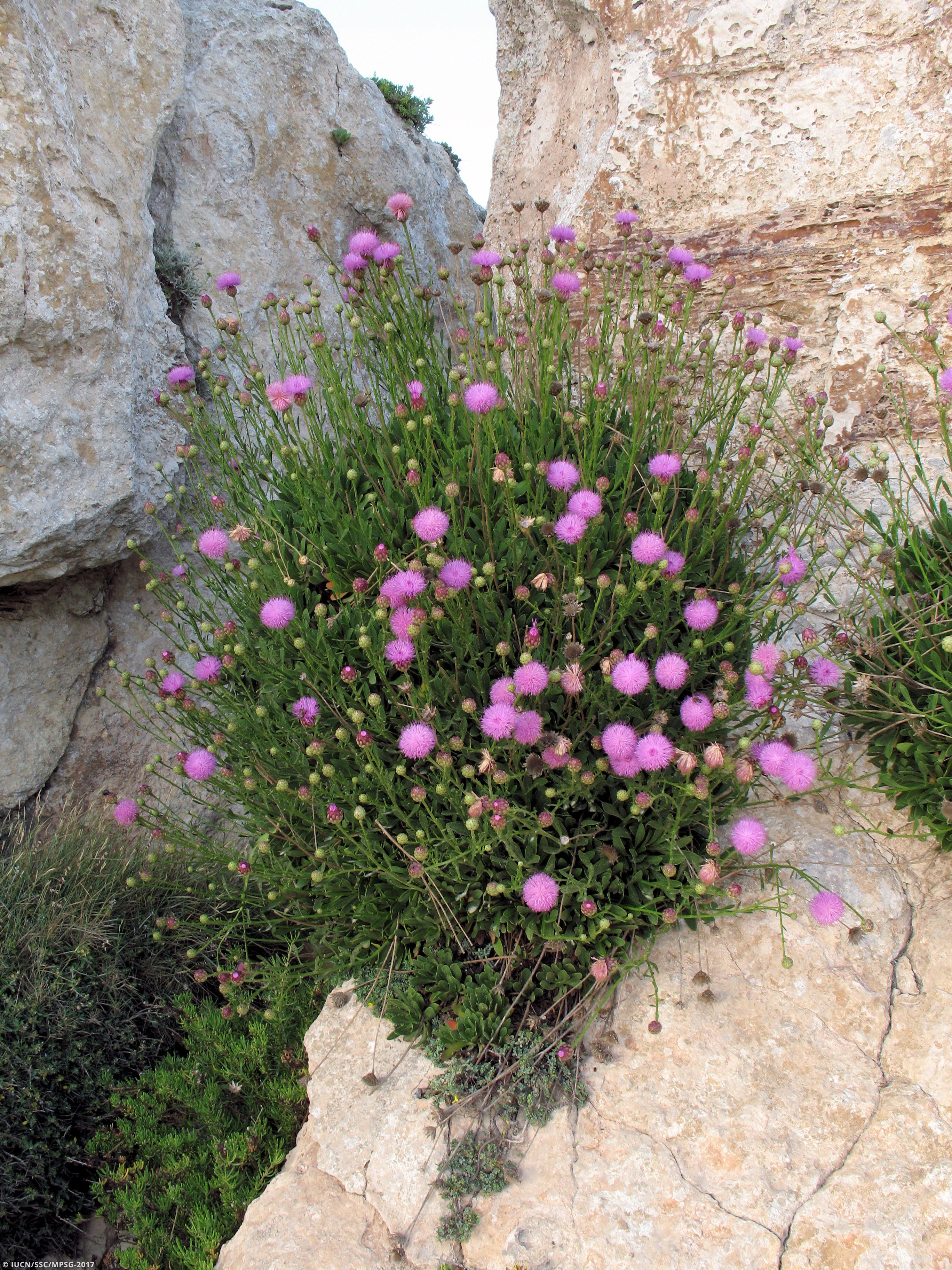 The Maltese rock-centaury is easily recognised by being the only rupicolous shrub which forms dark green foliage and large, purple, thistle-like flowerheads in early summer. The shrubs normally measure 50-100 cm in diameter and form semi-succulent, broadly oblanceolate to spathulate, glabrous leaves crowded at the upper parts of the branches. At the end of May, a flowering stalk is formed from the top of every branch giving rise to a simple or few-branched inflorescence producing terminal, capitate flower heads, which are composed of a few rows of smooth, spineless involucral bracts and numerous, tubular, magenta-purple florets, collectively forming a rather globular flower head about 4 cm wide. Flowers persist through July and set their small seeds, which are equipped with a pappus for seed dispersal by wind, in August.