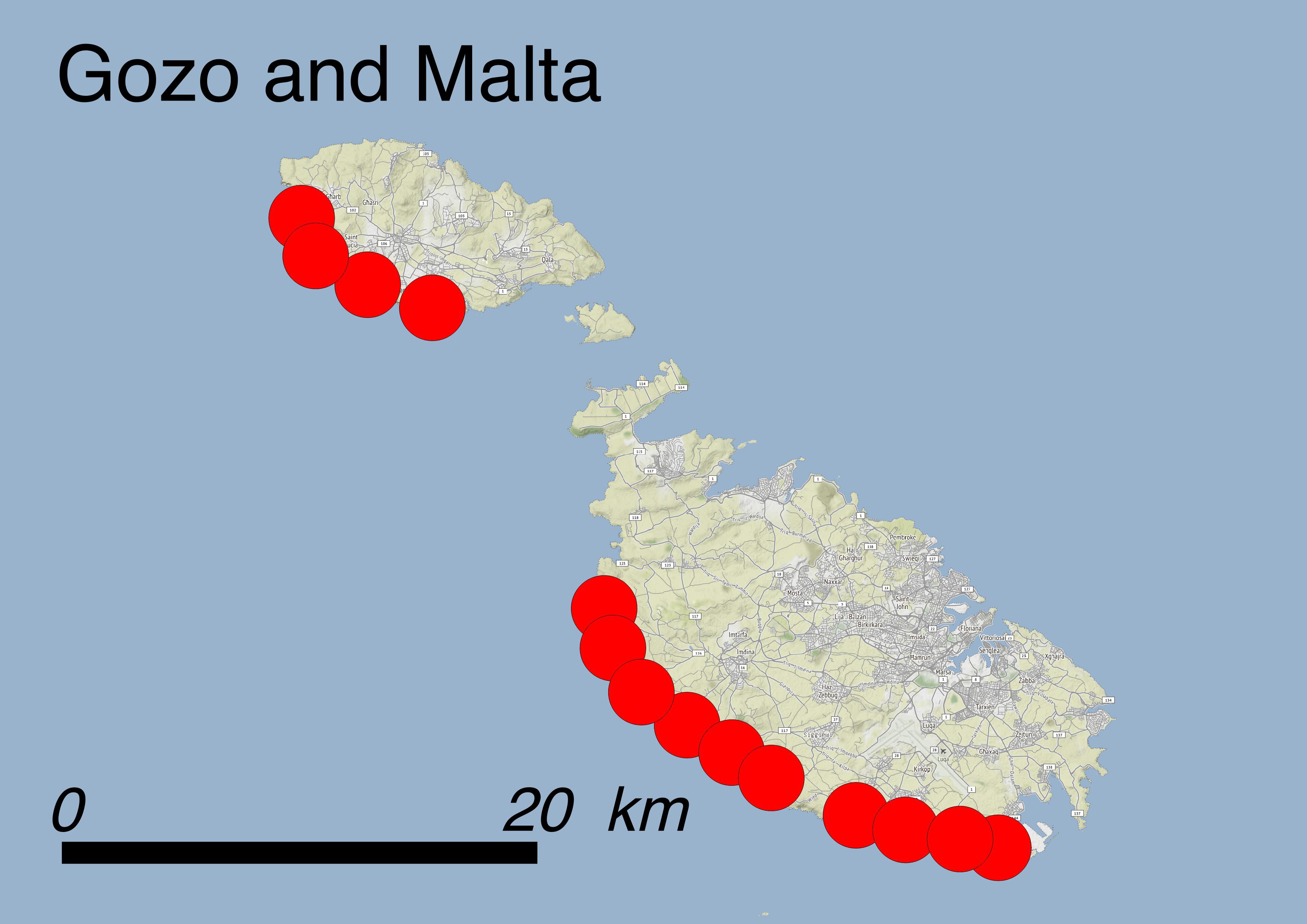 The whole population is severely fragmented and is mainly located in three subpopulations found along a considerable stretch (approximately 25 km) of the coastal cliffs from Fomm ir-Riħ (Rabat) to Għar Ħasan (Birżebbuġa), with a gap of almost 3 km from Għar Lapsi (Siġġiewi) to Wied iż-Żurrieq (Żurrieq) mainly due to unsuitable habitat. In Gozo, the distribution is less continuous, with three smaller subpopulations at Wardija-Xlendi cliffs (San Lawrenz), Sanap cliffs (Munxar) and Ta’ Ċenċ cliffs (Sannat), each about 1.5 km long. The resulting EOO is 153 km2 and the AOO is 76 km2. Counting individuals on the sheer cliffs is very difficult but 20'000 individuals by inspection is a reasonable estimate. Using these data, the species has been reclassified into Category EN (Endangered) according to IUCN Red List Criteria B1ab(i,ii,iii,iv)+2ab(i,ii,iii,iv). This assessment is based on the observation of a slight decline in both habitat quality and the number of mature individuals and taking into account the severe fragmentation of the whole population.