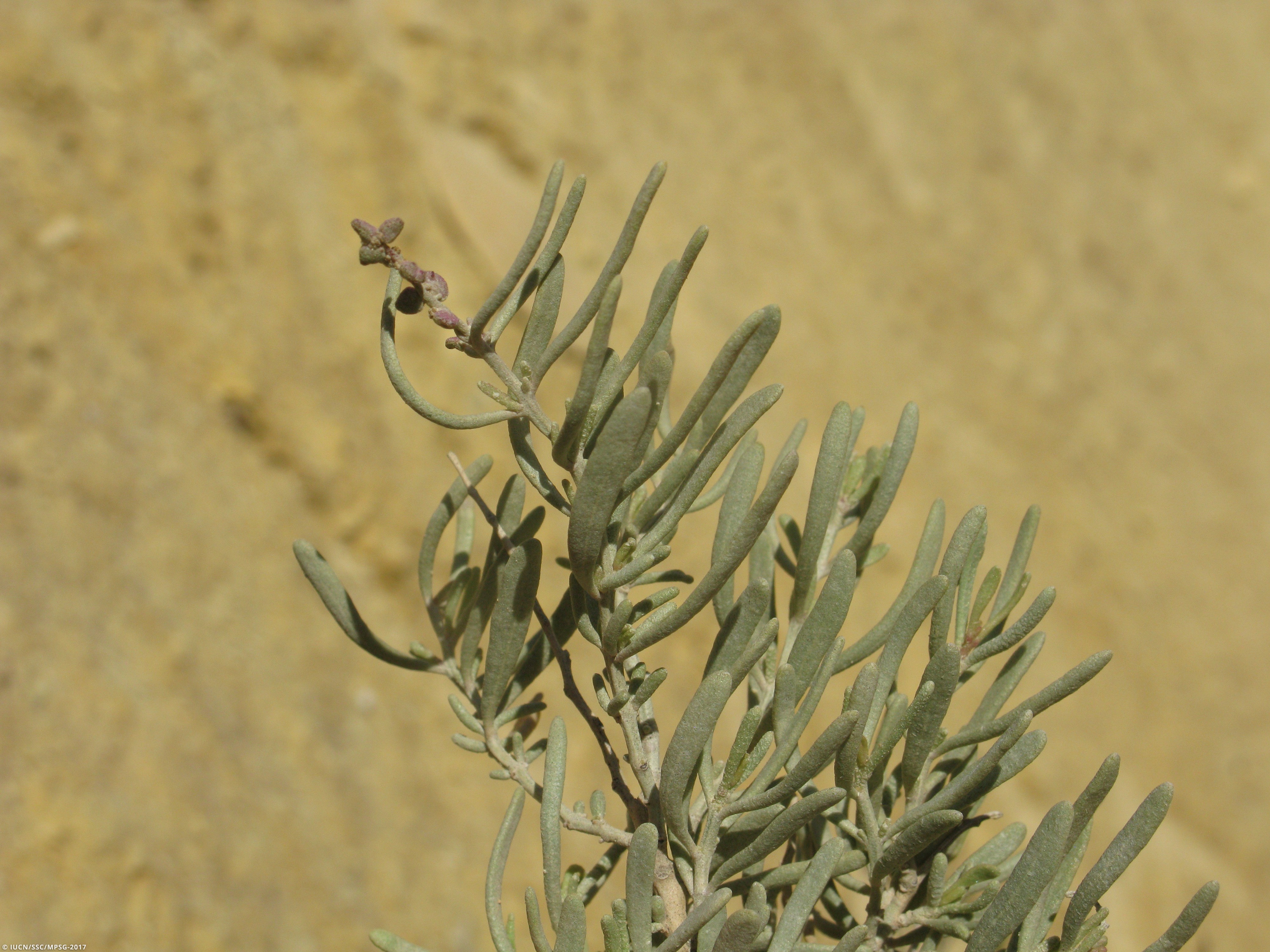 The Maltese cliff-orache is an evergreen, perennial, multi-branched shrub reaching up to 80 cm in diameter. The leaves are silvery-green, narrow-elliptical, up to 5 cm long, somewhat fleshy and hence adapted to absorb and retain air moisture. The inflorescences are variable, but usually form sparse branches with numerous small inconspicuous flowers blooming between August and September. The fruits ripen in November: they are small achenes, enclosed in flattened lanceolate to rounded bracts, initially pale green then turning deep purple-red and form small appendages acting like wings to facilitate wind dispersal.