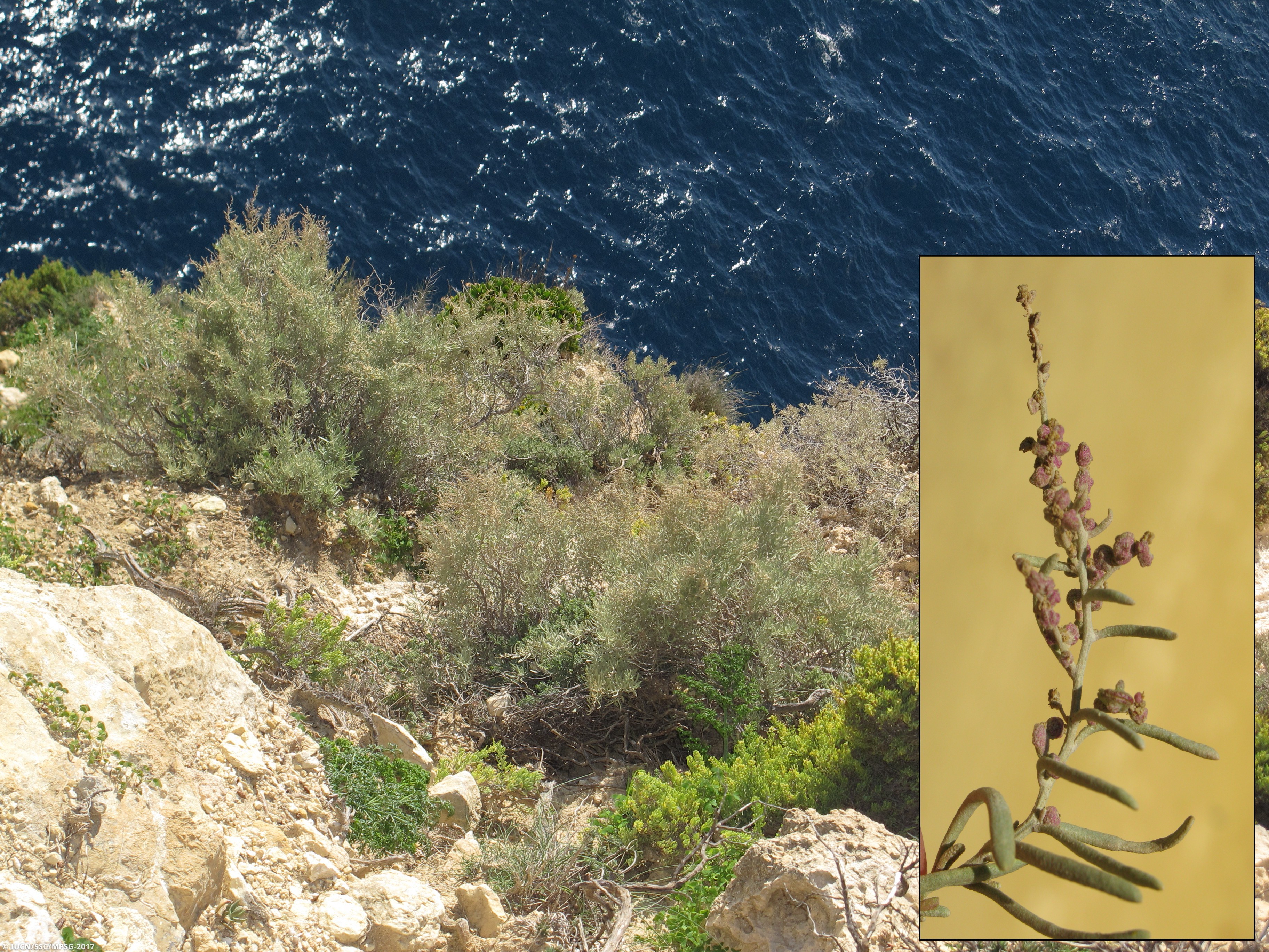 This species has several traits which are considered ‘primitive’ in an evolutionary perspective, such as an unusual chromosome number of 10 rather than 9 like all other species of the genus Atriplex. It probably represents a relict element of the Tertiary flora like some other chasmophytic endemics. In earlier works, it was confused with Halimione portulacoides, a smaller marshland plant that is also present on the Maltese Islands. Old and not confirmed records on the occurrence of Atriplex mollis on the Maltese Archipelago may perhaps be referred to this species.