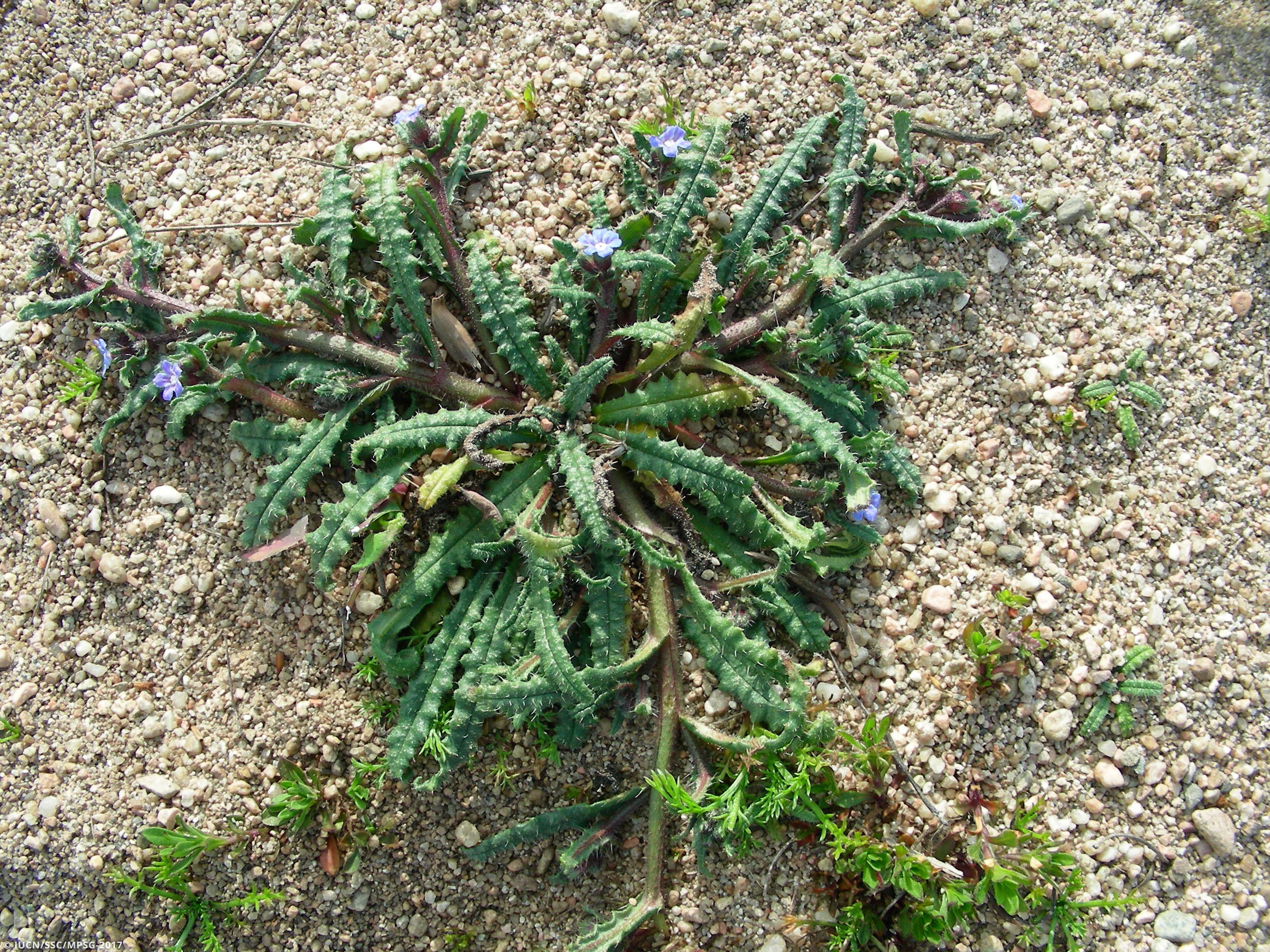 Anchusa crispa is a biannual or short-lived perennial, rarely annual herb, 10 to 35 cm tall. The ramified stem is erect at the base and then decumbent, and is covered with long erect and rigid hairs. The leaves are 5-10 cm long, lanceolate and undulate-crispate. Flowering occurs between March and June; the pale blue or purplish (white for the Sardinian subpopulation of Porticciolo) tubular flowers are grouped into loose alternate inflorescences. The populations of Sardinia are now referred to two different subspecies, A. crispa subsp. crispa and A. crispa subsp. maritima. Slight differences have been detected also among western and eastern Corsican populations: ongoing investigations will probably clarify whether they are worth being assigned to different subspecies as well.
