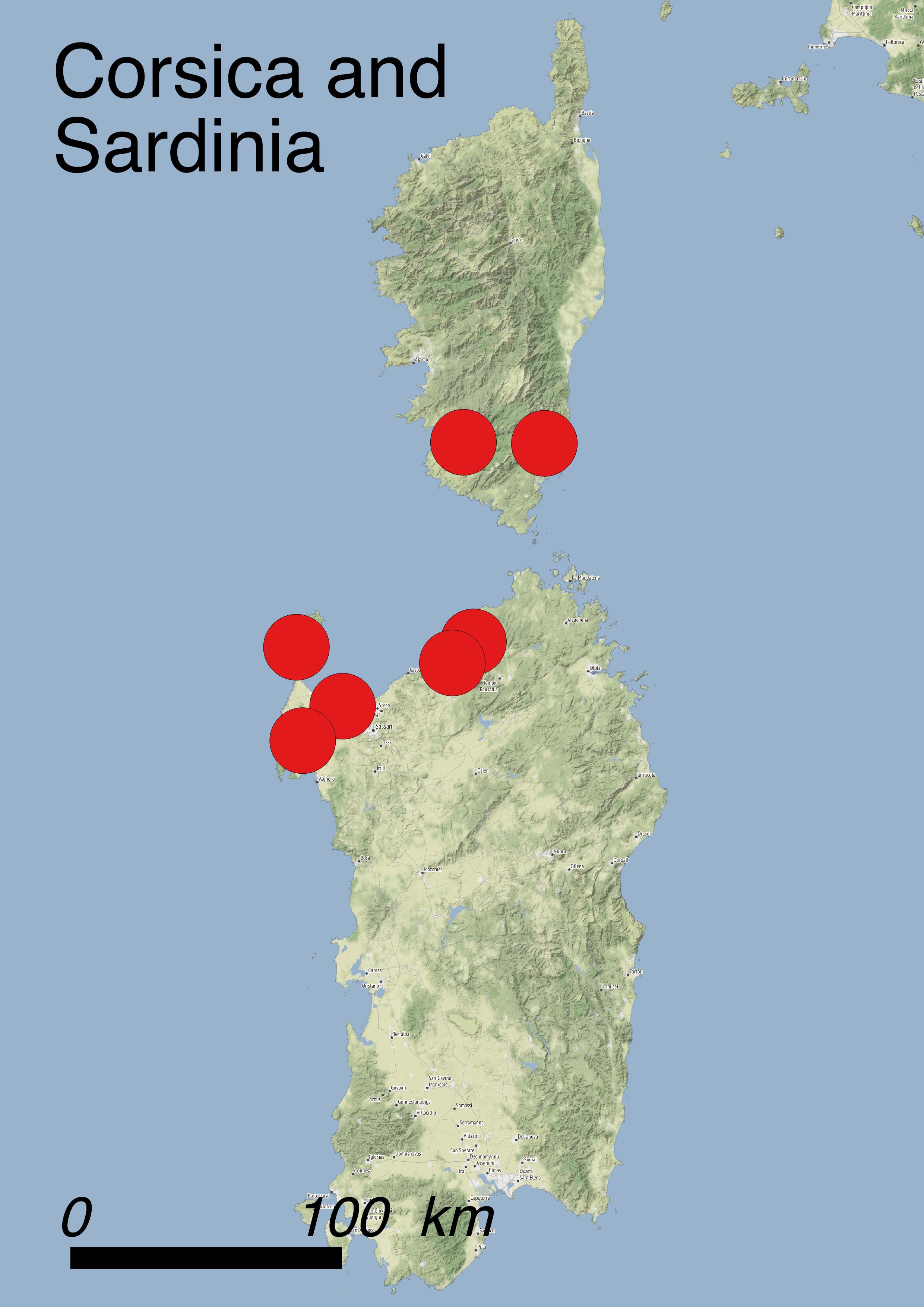 Up to now 14 subpopulations of Anchusa crispa are known to grow along the NW coasts of Sardinia and 6 in Corsica. The global AOO of the species is 76 km2 (56 in Sardinia and 20 in Corsica). A. crispa prefers sunny places on the upper part of sand shores (habitat code 13.3: Coastal Sand Dunes). It generally grows on coarse sands and gravel and it is often found near estuaries within thermo-hygrophilous scrubland communities dominated by Tamarix africana (5.3: Shrub-dominated wetlands). The most common co-occurring species are Elytrigia juncea, Glaucium flavum, Ammophila arenaria subsp. arundinacea and several other psammo-nitrophilous annuals and biennials.