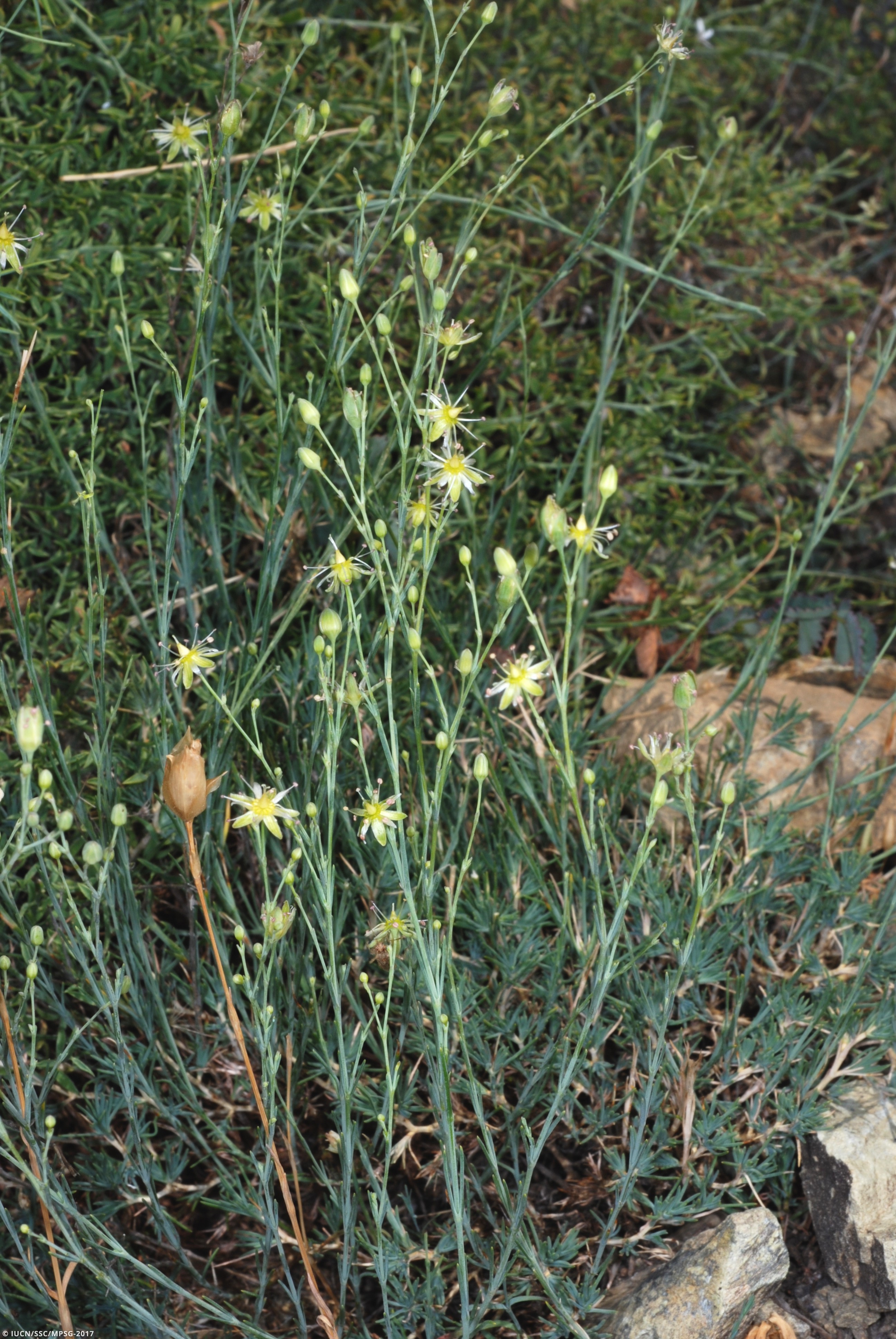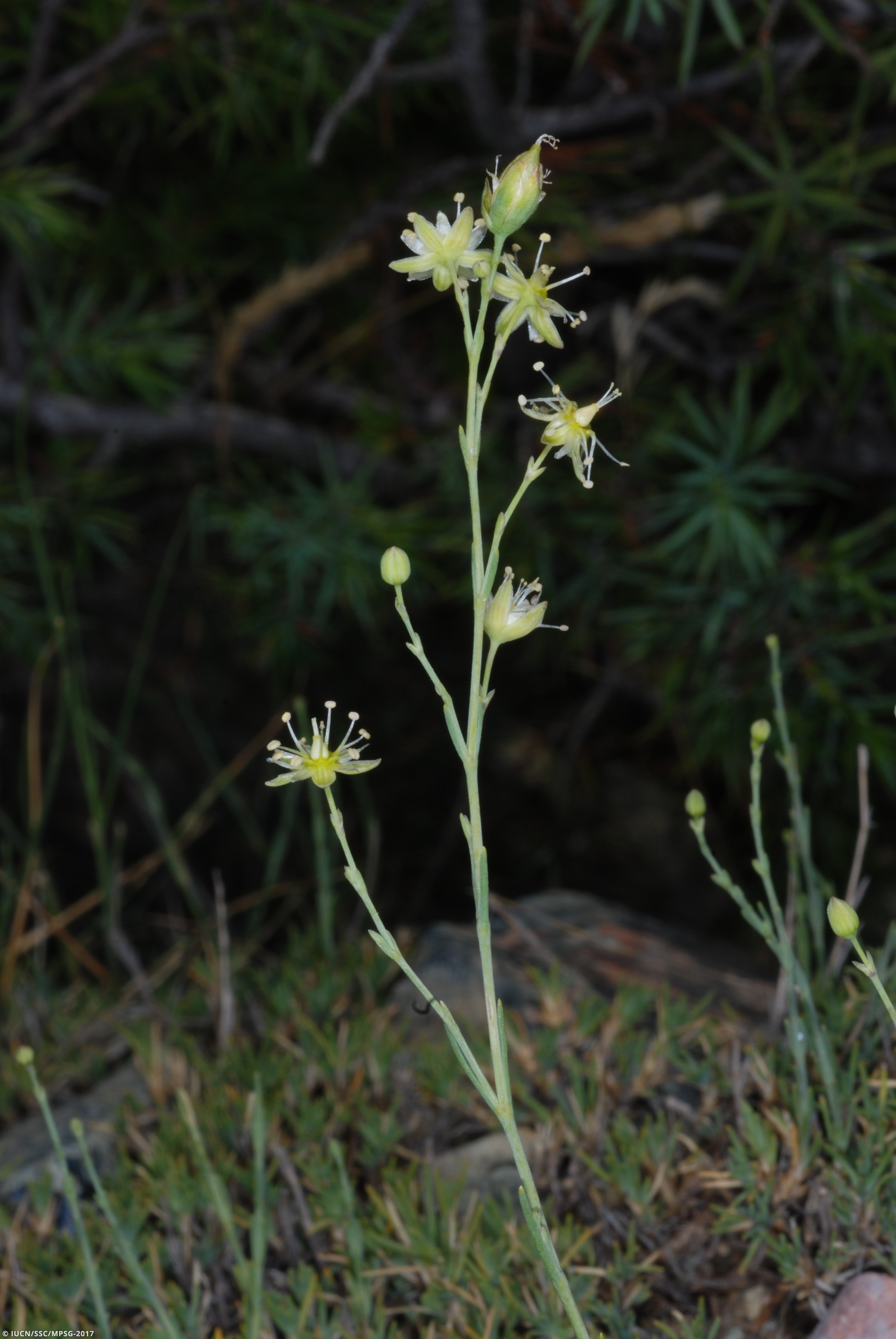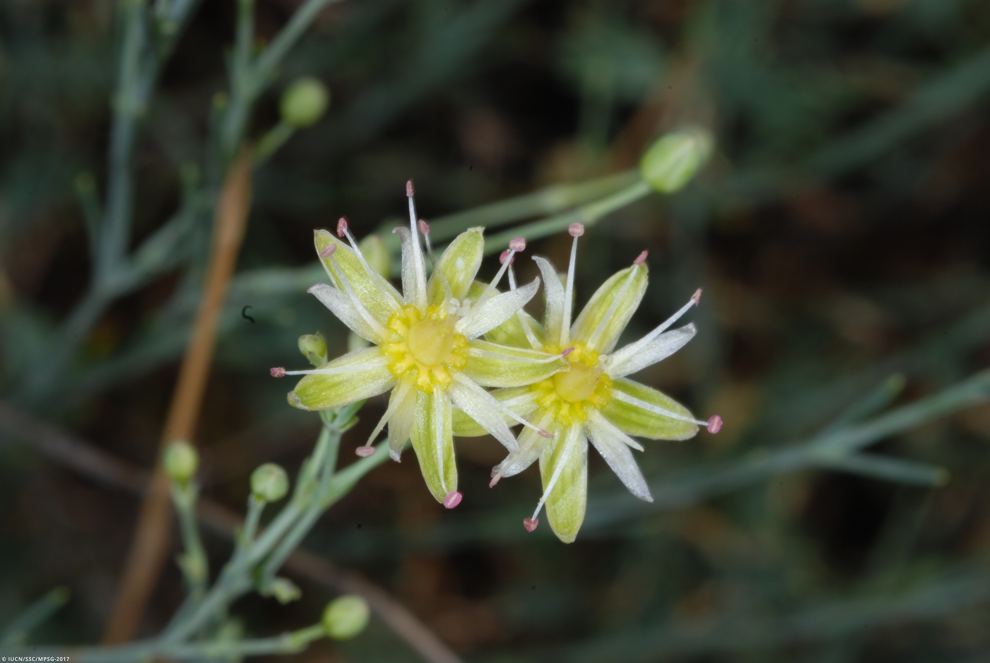This species has been categorized as CR (Critically Endangered) according to IUCN Red List Criteria B1ab(i,ii,iii,v)+2ab(i,ii,iii,v) because the species is known from a single location whose surface is approximately 0.5 ha (EOO = AOO) and the whole population counts a very small number of mature individuals : 312 and 519 individuals have been counted in 2006 and 2007, respectively. The species is severely threatened because of grazing from goats (threat 2.3.2: Small-holder grazing, ranching or farming), fires that are deliberately started by shepherds (threat 7.1.1: Fire and fire suppression - Increase in fire frequency/intensity), road (threat 4.1: Roads and railroads) and parking (threat 6.3: Work and other activities) construction, which have already destroyed about 0.1 ha (i.e. ca. 20%) of the only known population and the creation of an eco-touristic stone path crossing the population (threat: 1.3. Tourist and recreational activities).