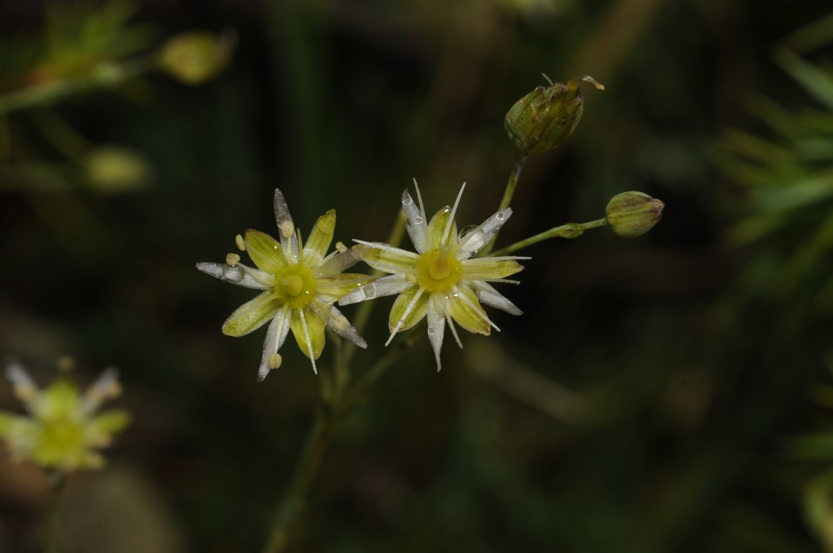 This perennial plant forms loose mats or cushions. It is woody at the base and hairless. The non-flowering shoots are up to 4.5 cm long. The tiny rigid leaves are 2-11 mm long, linear, with pointed tips and slightly rough margins, and are closely grouped together. The flowering stems are different from the sterile ones because they bear only 8-14 pairs of leaves, which vary in size and shape, while leaves on sterile shoots form dense obconical fascicles. The loose inflorescences are composed of 1 to 11 white flowers supported by small modified leaves that are often tinged with purple. The flower stalks measure 1.5-8 mm in length, and the stamens are inserted into a fleshy, light green disc. The flowering period lasts from mid-June to September. The fruit is a 4-6 mm long capsule that is slightly longer than the sepals.