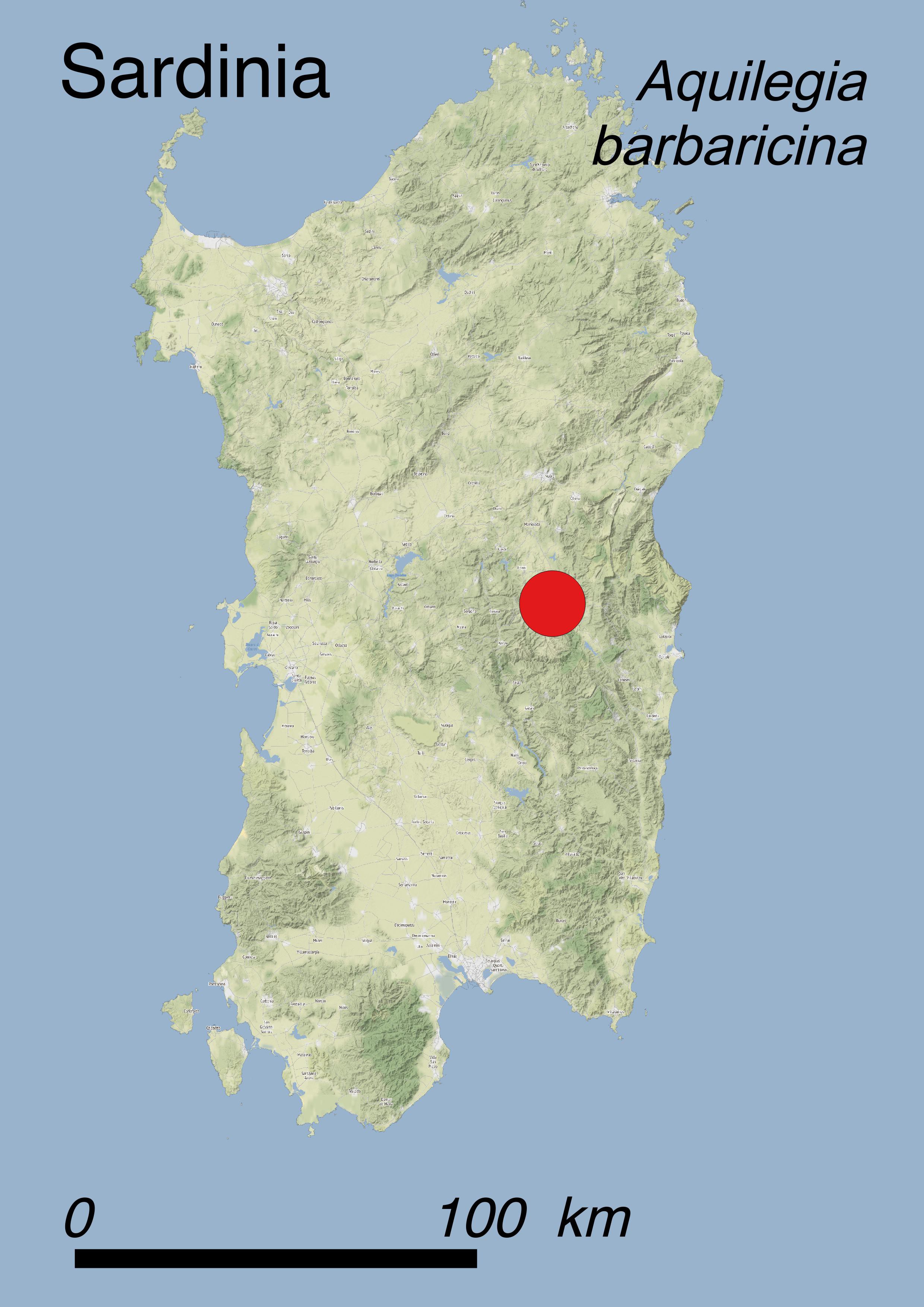 Until 2005 A. barbaricina was only known from a few localities, in the central part of Sardinia. Recent field investigations and a genetic study on the genus Aquilegia in Sardinia strongly improved the knowledge on the present distribution range of this species: to date seven populations have been found. They are located in Monte Spada, Rio Correboi, Nodu ’e Littipori (Fonni), Rio Olai (Orgosolo) and Su Sterzu (Talana) in the Gennargentu Massif, and, in Codula Orbisi (Urzulei) and in Badde Enis (Orgosolo) in the Supramontes region.