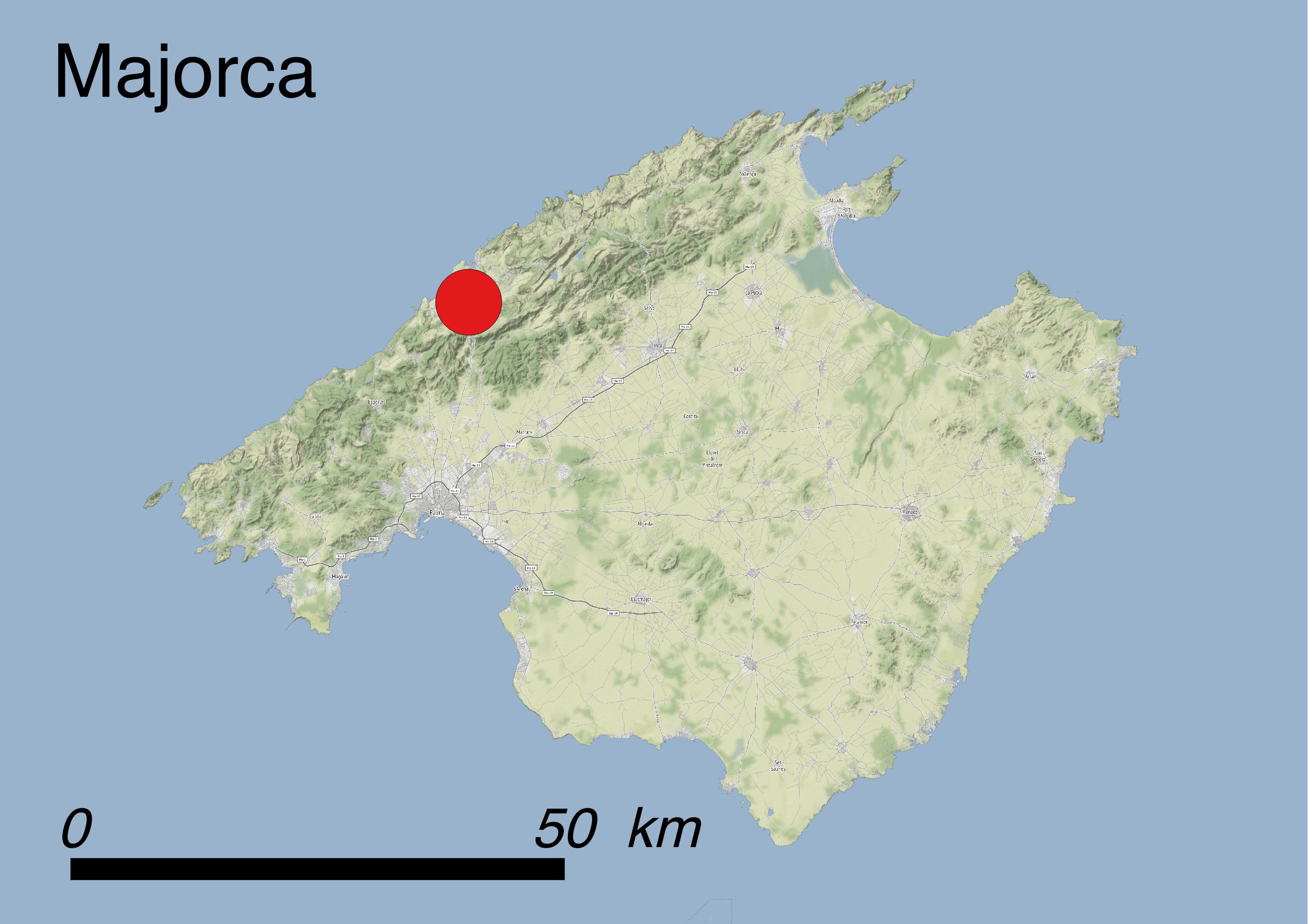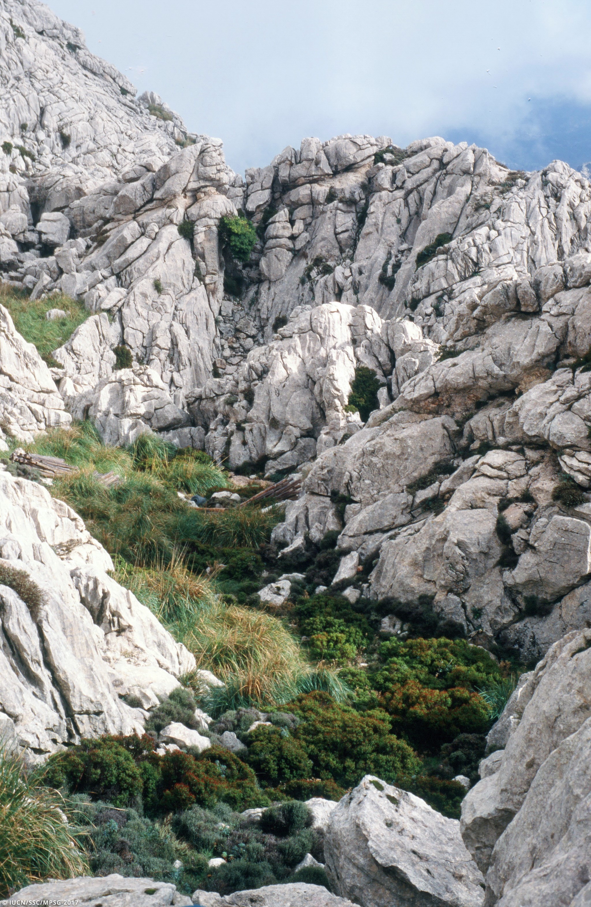 Endemic to the Balearic Islands, this species occurs in northern Majorca on the Tramuntana mountain range at 1300-1400 m a.s.l. It grows on limestone cliffs in shaded, slightly moist rock crevices and on rocky ridges (habitats 6.2: Inland cliffs. Rock pavements and outcrops and 6.4: Miscellaneous inland habitats with very sparse or no vegetation) with ca. 400 individuals spread over an area of less than 0.1 km2.