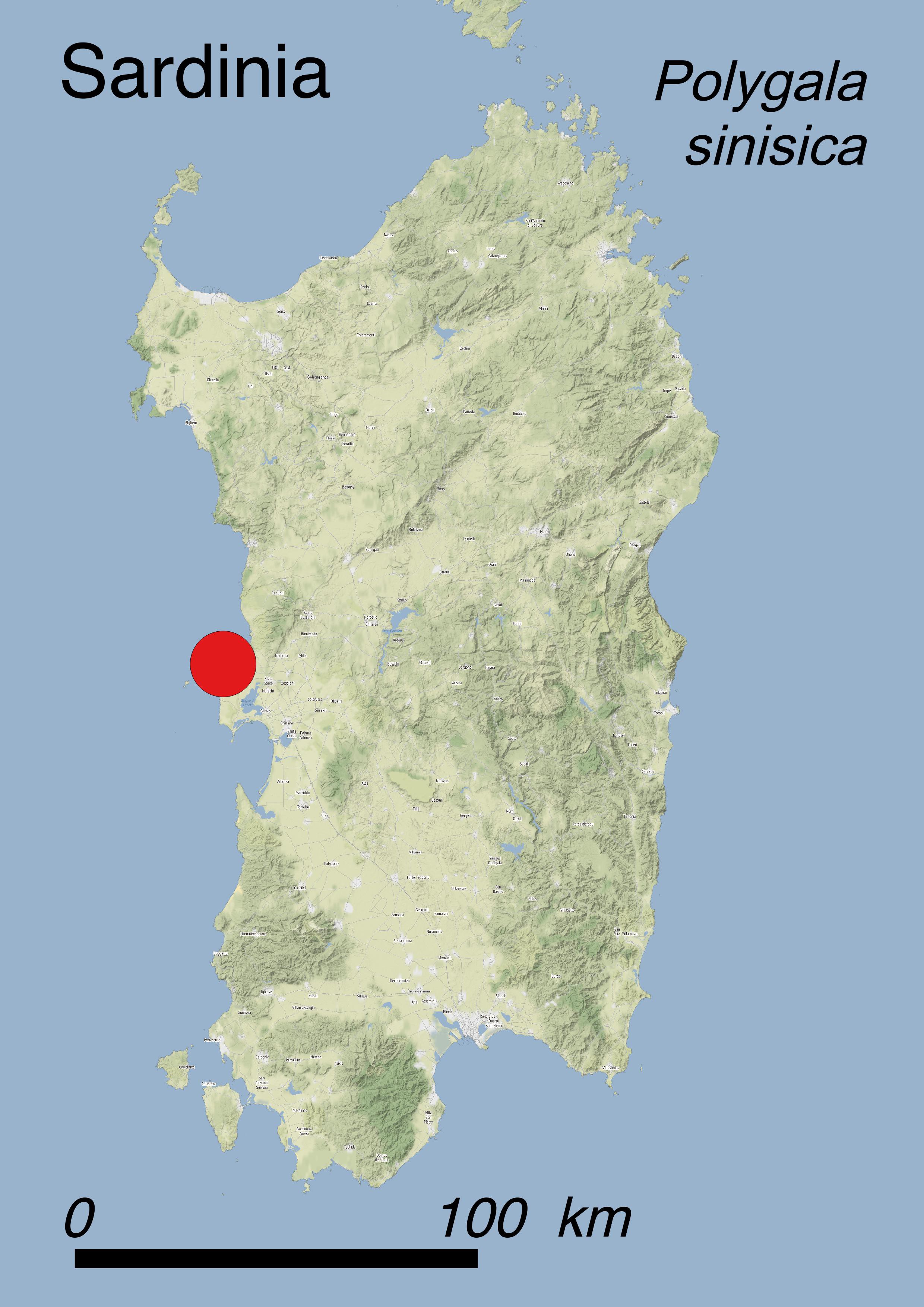 Polygala sinisica is only found in a single population covering a surface of ca. 1.6 ha in a restricted site along the coast of the Sinis Peninsula (Central-Western Sardinia). The population contains only ca. 70 individuals, 45 of them being mature plants.