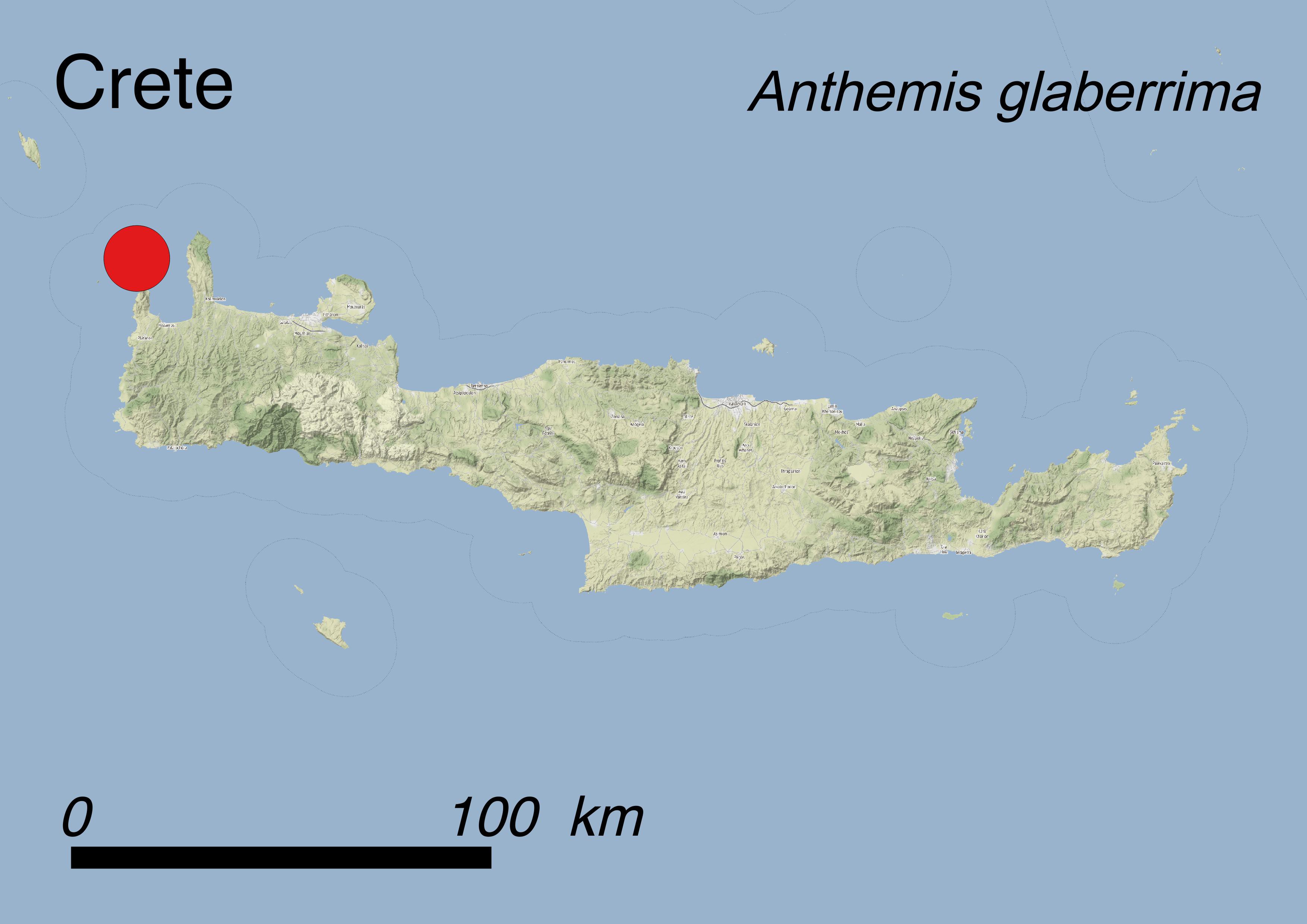 Anthemis glaberrima is endemic to the islets of Agria Gramvousa and Imeri Gramvousa, which are located at the north-western tip of the island of Crete, where it grows on littoral rocks (habitat code 13.1: Sea cliffs and Rocky Offshore Islands). The species was previously reported to occur also in a single locality of the prefecture of Chania in the western part of the main island. Recent accurate field surveys pointed out that this record probably issued from a misidentification with Anthemis rigida. The total AOO is ca. 0.035 km2, with 60'000 to 100'000 individuals. The subpopulation of Imeri Gramvousa covers an area of ca. 0.0015 km2 and consists of about 10'000 to 20'000 individuals.